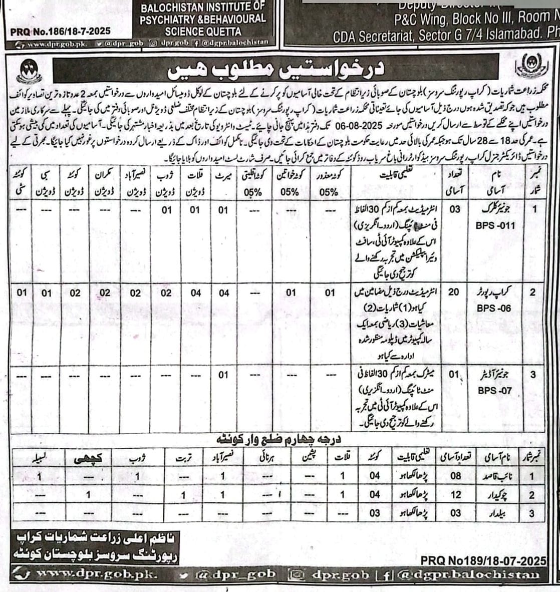 The Department of Agricultural Statistics – Crop Reporting Services Balochistan has announced 47 vacancies ranging from BPS-01 to BPS-11, as per the advertisement published on July 19, 2025. The last date to submit the application is August 6, 2025. Interested candidates must download both pages of the application form (PDF), attach all required documents, and submit the form accordingly: for district-level posts, submit at the relevant district office; for divisional-level posts, at the office of the respective Divisional Director; and for provincial-level posts, at the designated office in Quetta. The application form can be downloaded from the following link below. Ensure the form is accurately filled and submitted before the deadline.